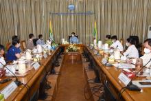 စီးပွားရေးနှင့် ကူးသန်းရောင်းဝယ်ရေးဝန်ကြီးဌာန၊ ပြည်ထောင်စုဝန်ကြီး ဒေါက်တာပွင့်ဆန်းသည် ၂၀၂၁ ခုနှစ်၊ ဧပြီလ ၂၇ ရက် နံနက် (၁၀:၀၀) နာရီအချိန်တွင် စီးပွားရေးနှင့် ကူးသန်းရောင်းဝယ်ရေးဝန်ကြီးဌာန၊ ဝန်ကြီးရုံးအစည်းအဝေးခန်းမ၌ ကျင်းပပြုလုပ်သည့် ကုန်သွယ်မှုမြှင့်တင်ရေးဆိုင်ရာကိစ္စရပ်များ၊ စားသုံးသူကာကွယ်ရေးဆိုင်ရာ ကိစ္စ ရပ်များ၊ မူပိုင်ခွင့်ဥပဒေဆိုင်ရာ အကောင်အထည်ဖော်ဆောင်ရွက်ရမည့် ကိစ္စရပ်များ၊ ပြည်တွင်း ကုန်စည်စီးဆင်းမှုအခြေအနေများနှင့် ပတ်သက်၍ အပတ်စဉ် ကျင်းပပြုလုပ်သည့် ဝန်ကြီး ဌာနတွင်း လုပ်ငန်းညှိနှိုင်းအစည်းအဝေးသို့ တက်ရောက်အမှာစကားပြောကြားသည်။